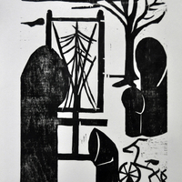 - Xilografía en negro con chimeneas y triciclo, y arboles y atril atrás.