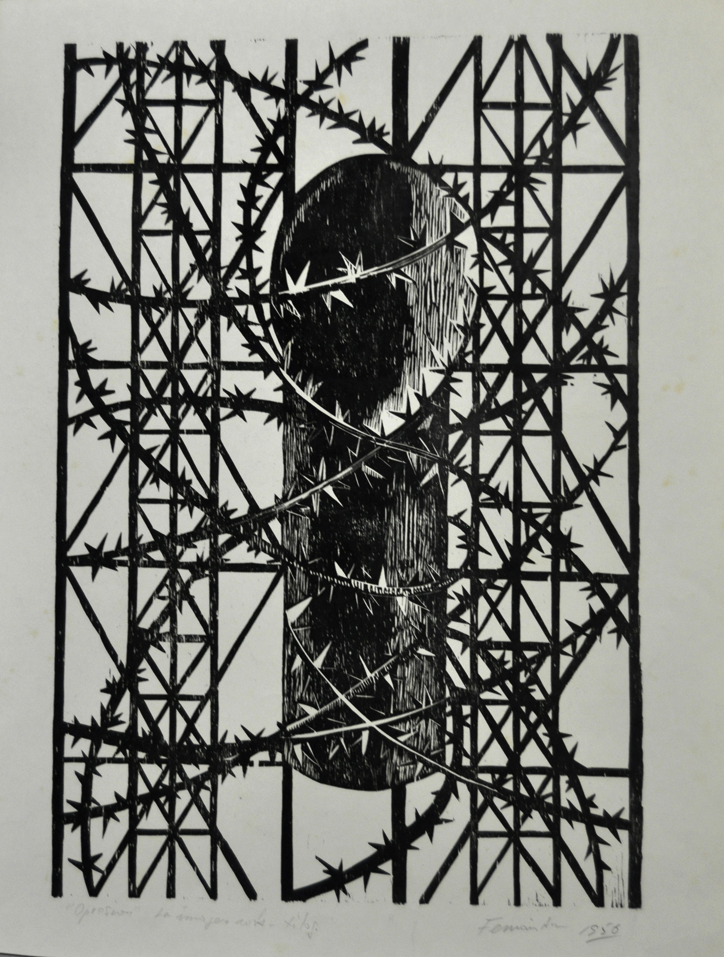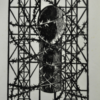 - Xilografia en blanco y negro. Chimenea rodeada de alambres de púa con estructura geométrica de fondo.