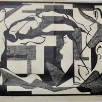- Xilografía en negro, Figuras femeninas en diferentes posiciones y texturas sobre fondo geométrico