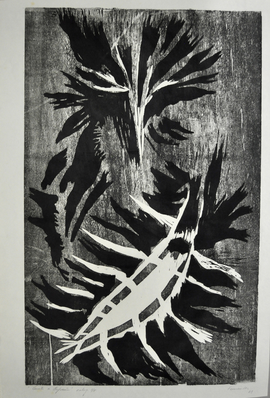 Xilografía en negro gris y rojo. Dos figuras triangulares con bordes curvos ,una de ellas con líneas rojas curvas fondo gris con marcas negras y en primer plano lineas negras y grises semicurvas